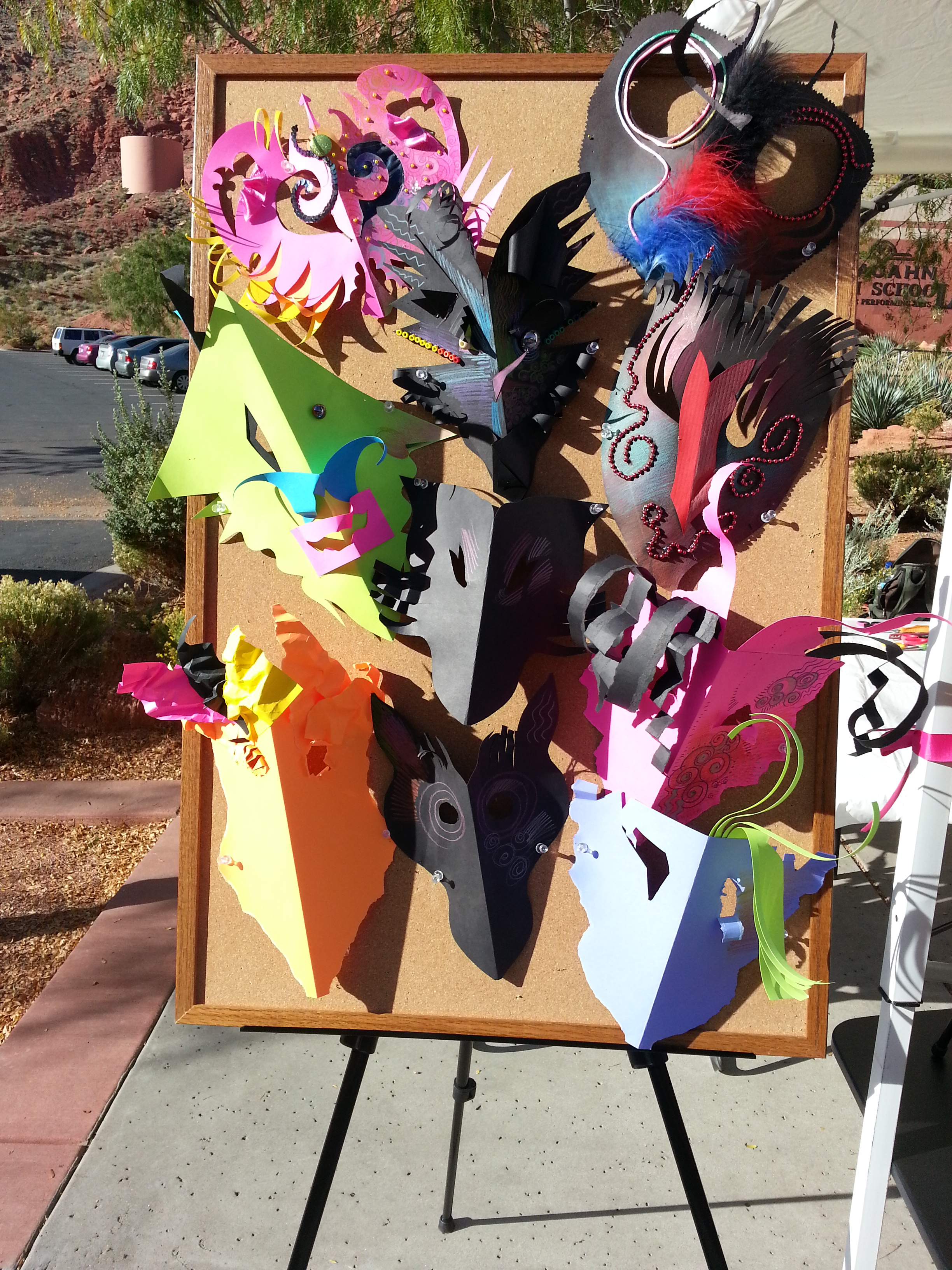 7. When you are done you can display your mask on the wall or bulletin board with push pins. It is important to pin one side of your mask to the wall and then bend the mask a bit at the fold before you pin the other side. This gives a 3-D look to your paper sculpture mask. Don’t hang it FLAT against the wall. A 3-D mask is more interesting as light in the room casts shadows and accentuates shapes.