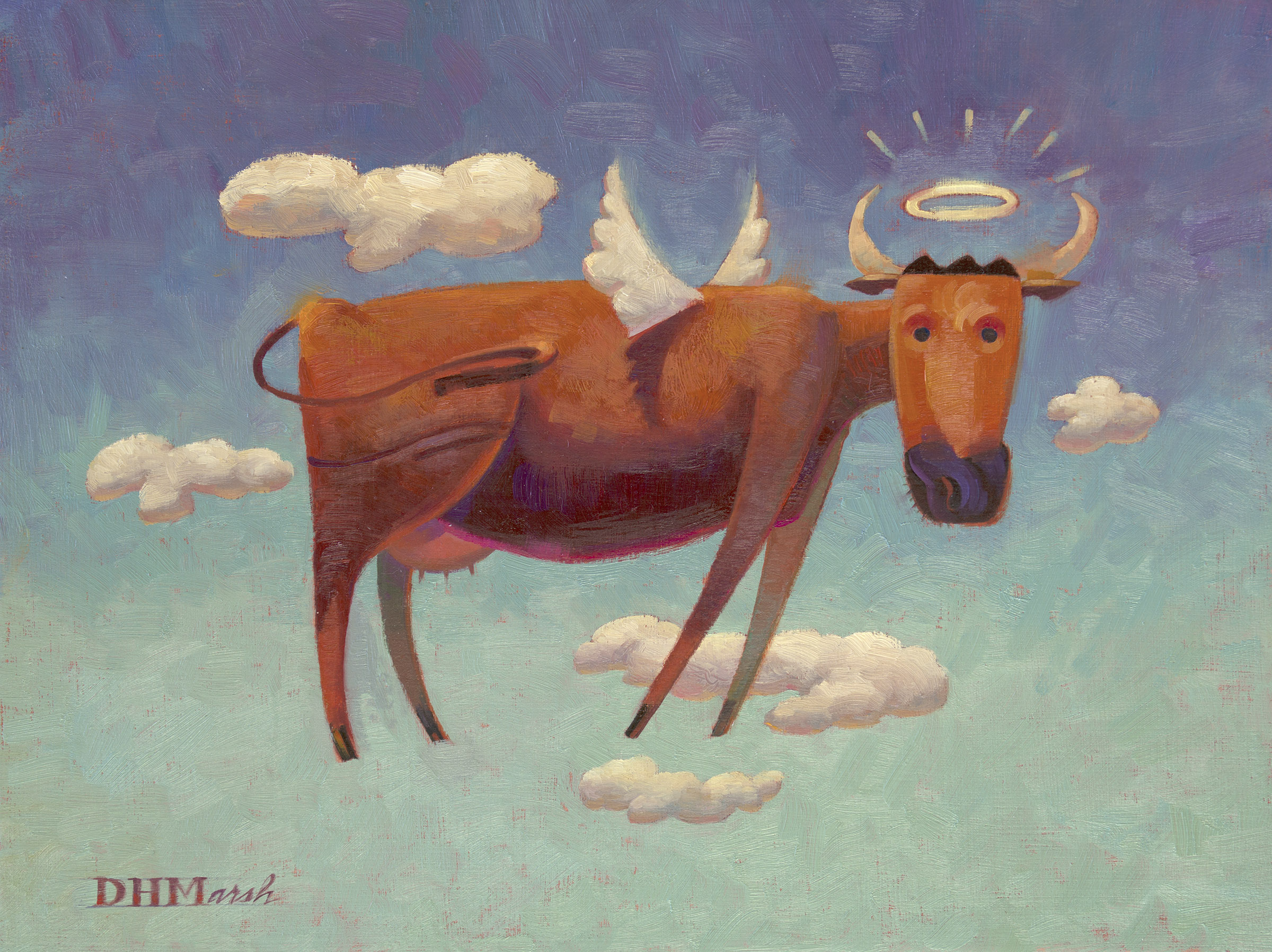 I have heard that a great movie, an important book, a political strategy can come from notes jotted down on a napkin at lunch. Since strokes of ideas can come at unexpected moments, if not captured, the idea might disappear into the already flooded corridors of the brain, perhaps, to be lost. A popular place for me to have a “stroke of an idea” has been at church, sitting in the relative quiet and contemplating the cosmos. Being an artist those ideas have become scattered sketches, doodles, and drawings in my journals and engagement calendars. For years I have entertained turning those ideas into colorful visuals or stories. Last year I marked, copied, and gathered all those scattered visuals into a central binder. Then in July of 2013 I began to paint them. Because they are from my imagination the style approach is much more stylized than my regular approach to painting which is more to the impressionistic/realism side. As I painted I had such feelings of joy and peace that I knew I had stepped over the threshold of a door into full self-expression. The first one was “Holy Cow!”. The sketch was made in my journal on the day that I sold four paintings and found out I didn’t have cancer anymore. That became my annual “Yee-Haa!” Day, November 15. As others followed I needed a name for the series. “The Heart of the Conversation” was born from a conversation with my daughter, Katie, who gave me the name suggestion: “Missing The Heart of the Conversation” for the second one. How appropriate to these images which are a visual “play” on words. Visit my website http://dilleenmarsh.com/to see more of this series. Enjoy…as I am.