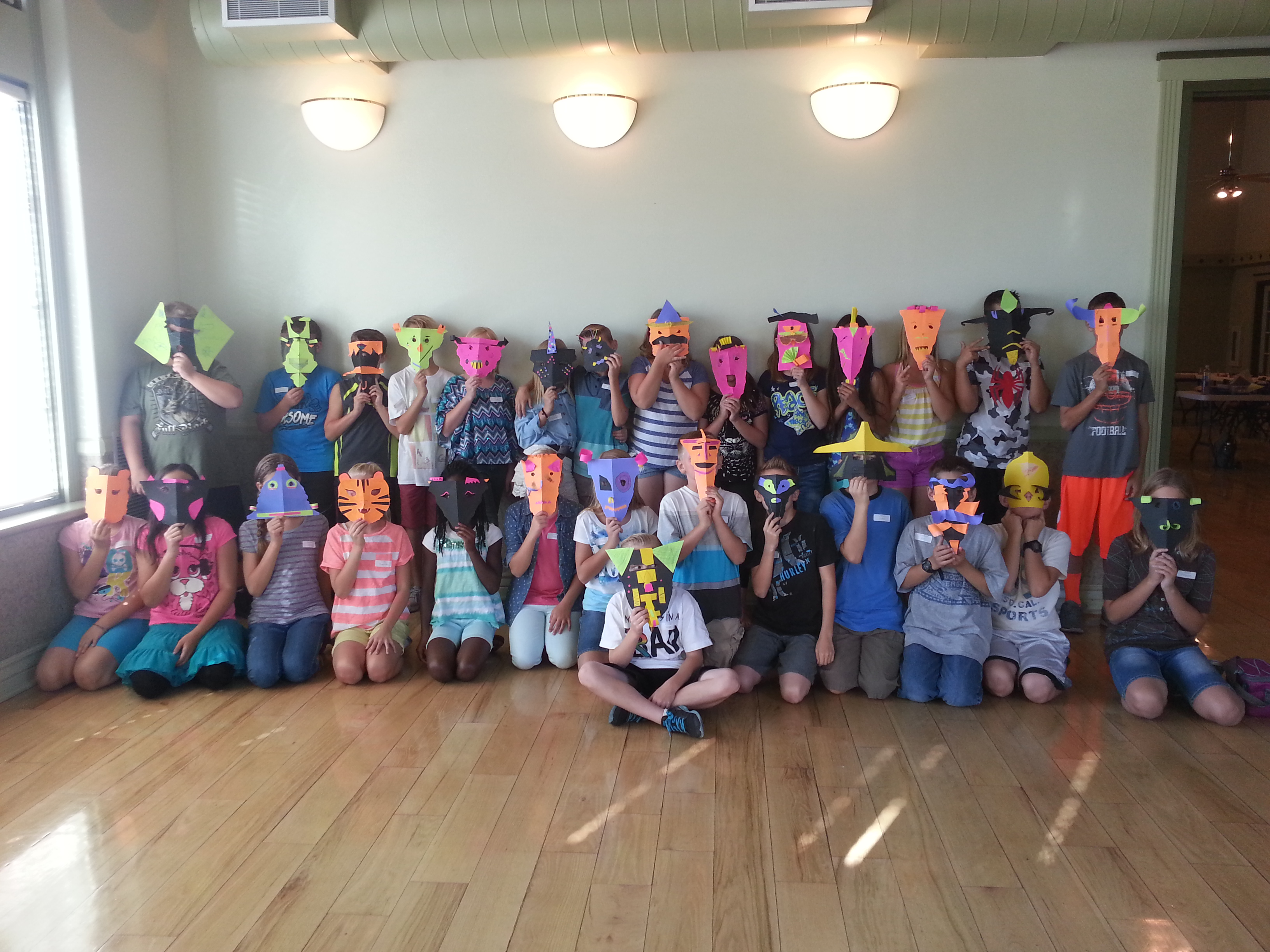 Now go look at yourself in the mirror! When you take these home, don’t put them on the refrigerator door…push pin them on a bulletin board or wall space somewhere. The key to keeping them 3-D is to fold slightly so your mask sticks out from the wall and then push pin it in place. Do not pin it flat to the wall. When your art is 3-D it will cast interesting shadows. You can always put more decoration on your mask. Think of all the possibilities in your mom’s or grandma’s craft drawer!