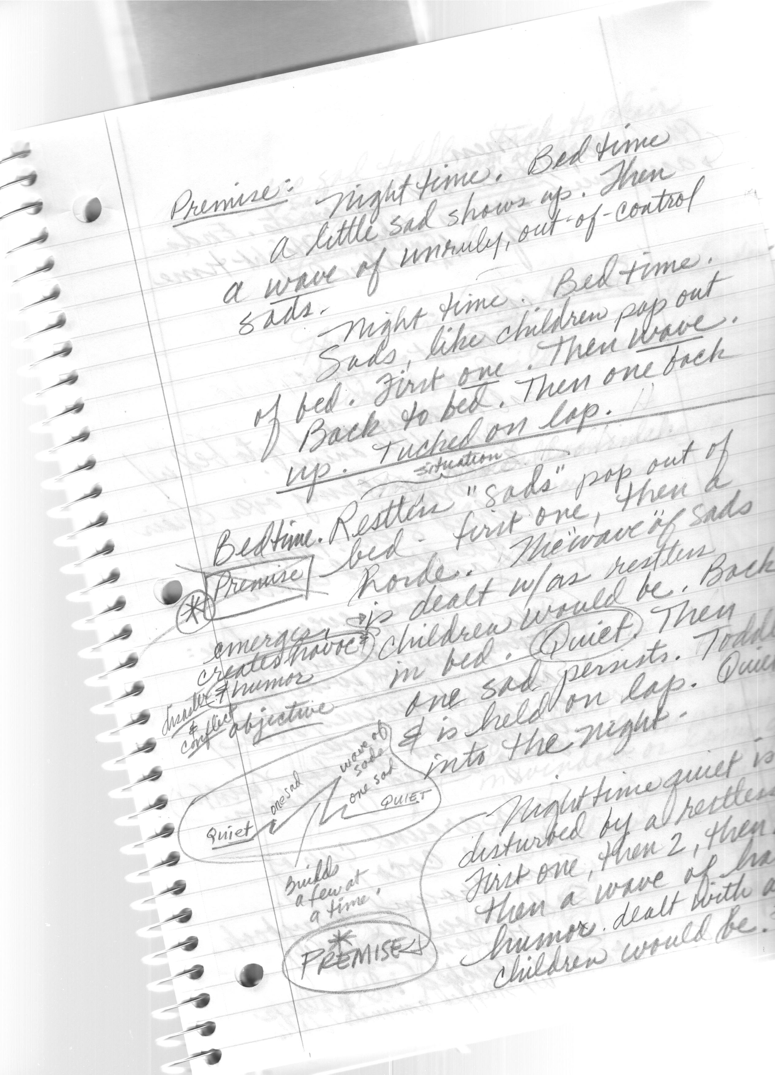 DOODLE!!! Actually these little sketches are called thumbnails–because of their size. They range in size from 1 to 1 1/2 inches per page. The small size gave me a useful overview of visual ‘pacing’ in the story. Like a camera zooming in and out, placing small images and large images in an arrangement to keep the reader engaged.